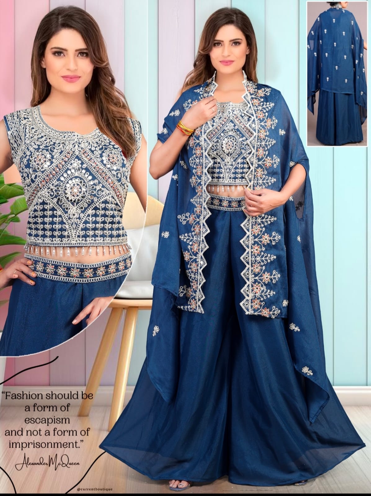 Make a sophisticated statement at any event with this stunning three-piece set in a rich deep navy blue. This ensemble features a flowing silhouette and intricate embroidery, perfect for wedding festivities, formal events, or festive gatherings.