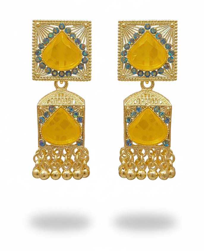 These breathtaking Temple Earrings celebrate the rich artistry of traditional Indian jewelry. Featuring a striking design that combines rich yellow hues with detailed gold-tone metalwork, these earrings are perfect for adding a touch of opulent heritage to your most formal outfits.