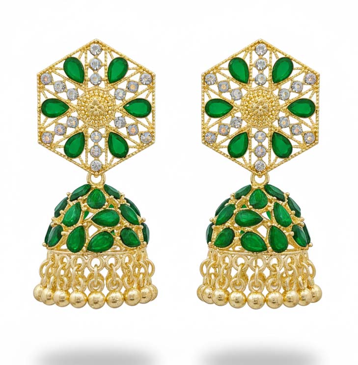 Jhumka Dome: The main bell component features rich green stones set within ornate gold-tone metalwork. The design is often filigreed or patterned.